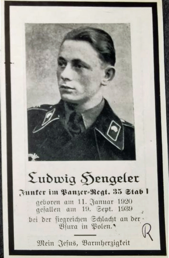 Funker, Panzer‑Schütze | HENGELER | Ludwig | 11.01.1920 Eichstätt | 19.09.1939 an der Bsura, bei Sladow | Panzer Regt. 35, Stabskomp. I | begraben am Weichselbogen bei Sladow |