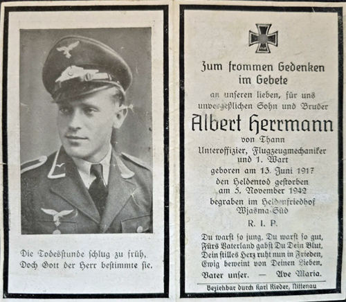 Unteroffizier | HERRMANN | Albert | 13.06.1917 Thann | 05.11.1942 Flugplatz Wjasma Süd | Stuka-Geschwader 2 „Immelmann“, 7. Staffel | begraben Heldenfriedhof Wjasma Süd, Block A, Grab 766 |