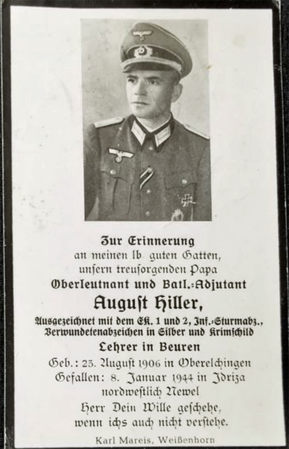 HILLER | August | 23.08.1906 Oberelchingen | 08.01.1944 Idriza | Gren.Rgt.438, Stab II. |