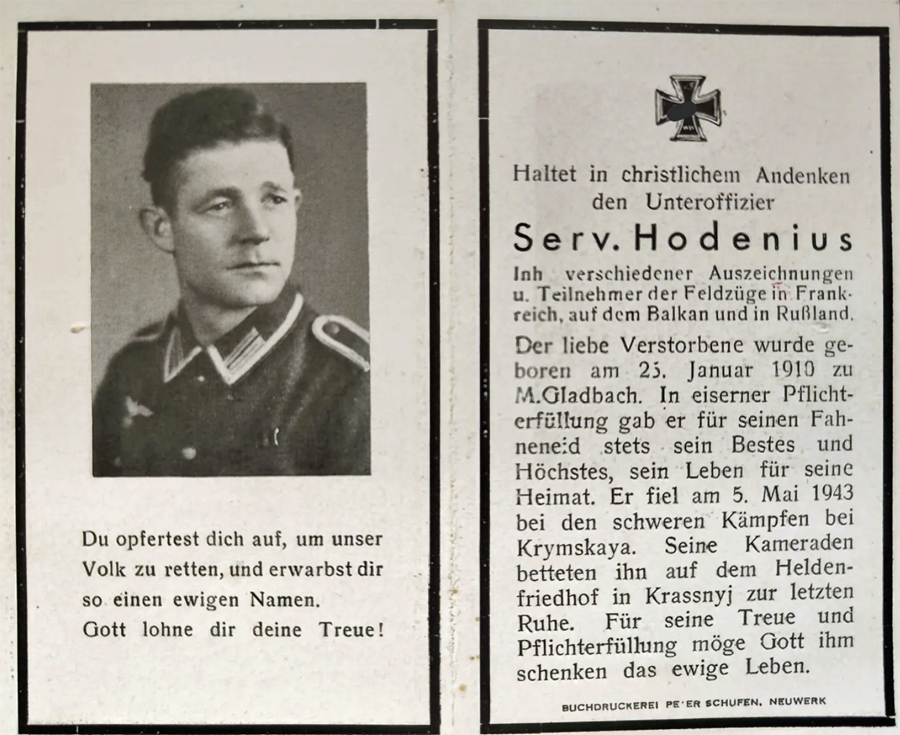 Unteroffizier | HODENIUS | Servatius | 25.01.1910 Mönchengladbach | 05.05.1943 5 km südw. Krymskaja | Panzer Gren. Regt. 93, 2.Komp. |