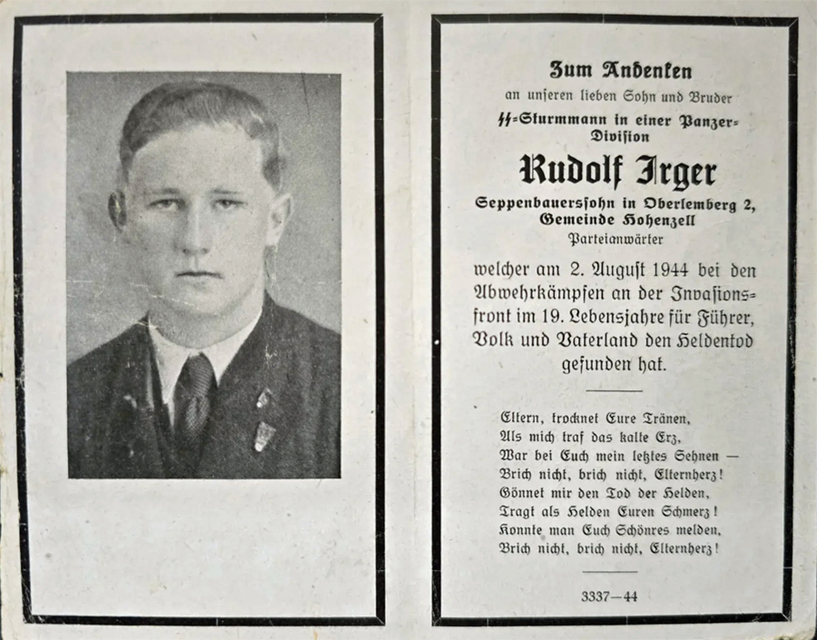 SS‑Sturmmann | IRGER | Rudolf | 02.04.1944 Invasionsfront | Panzerdivision | im 19. Lebensjahr |