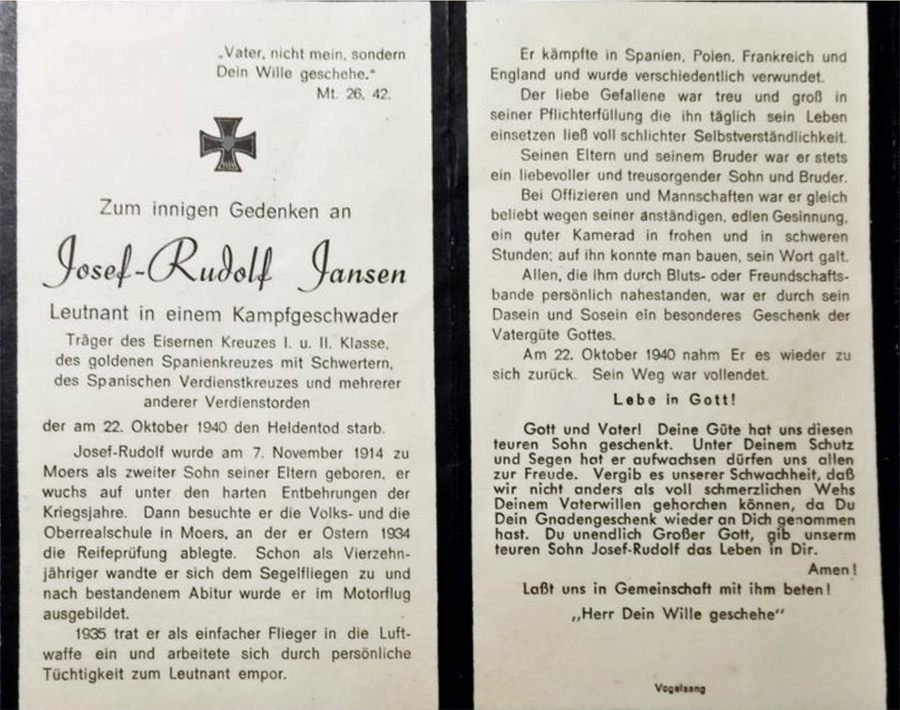 Leutnant | JANSEN | Josef‑Rudolf | 07.11.1914 Moers | 22.10.1940 10 km vor Rennes | Kampfgeschwader 27, "Boelke", 9. Staffel | Kriegsgräberstätte in Mont d'Huisnes: Gruft 9 Grabkammer 52, JANSEN Rudolf‑Josef |
