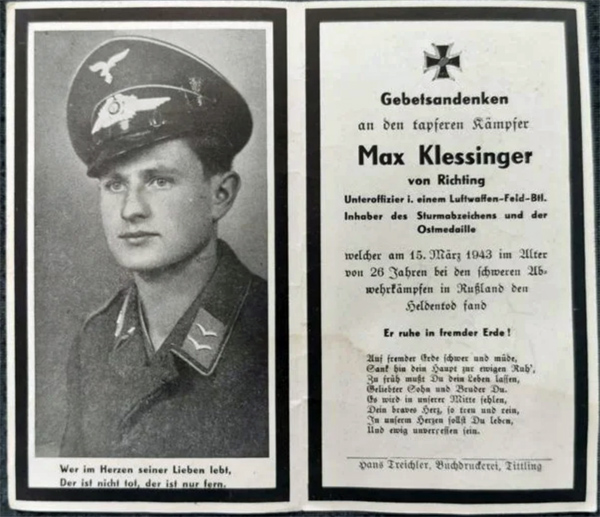 Unteroffizier | KLESSINGER | Max | 14.12.1916 Richting | 15.03.1943 Rußland, Parfinostr. | Luftwaffen-Feld‑Btl. Feld‑Regt. der Luftwaffe 4 | Grab derzeit noch in: Staraja Russa - Russland |