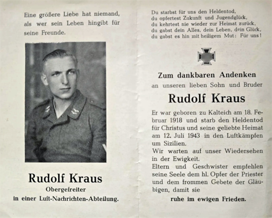 Obergefreiter | KRAUS | Rudolf | 18.02.1918 Kalteich, Kreis Altenkirchen | 12.07.1943 Sizilien, bei Catania | Luft‑Nachrichten-Regiment 110, 9.Komp. |