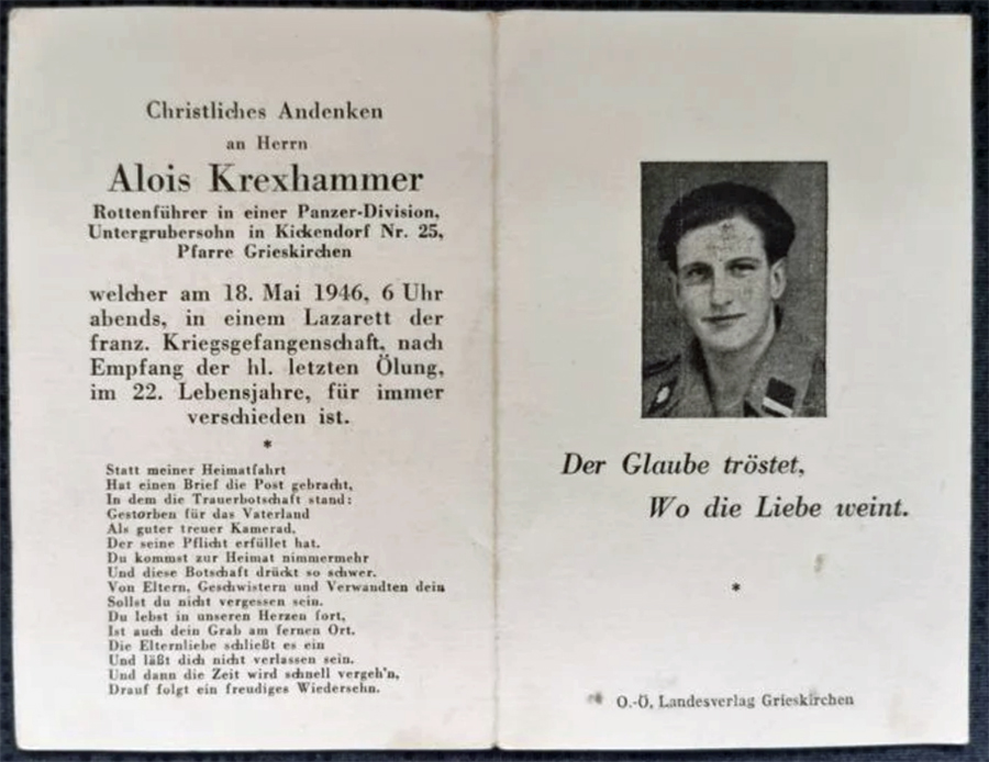 Rottenführer | KREXHAMMER | Alois | 01.05.1921 Hirschaid | 18.05.1946 Lazarett, franz. Kriegesgefangenschaft, Mulsanne | Panzer‑Division | Kriegsgräberstätte in Mont d'Huisnes: Gruft 68 Grabkammer 59 |