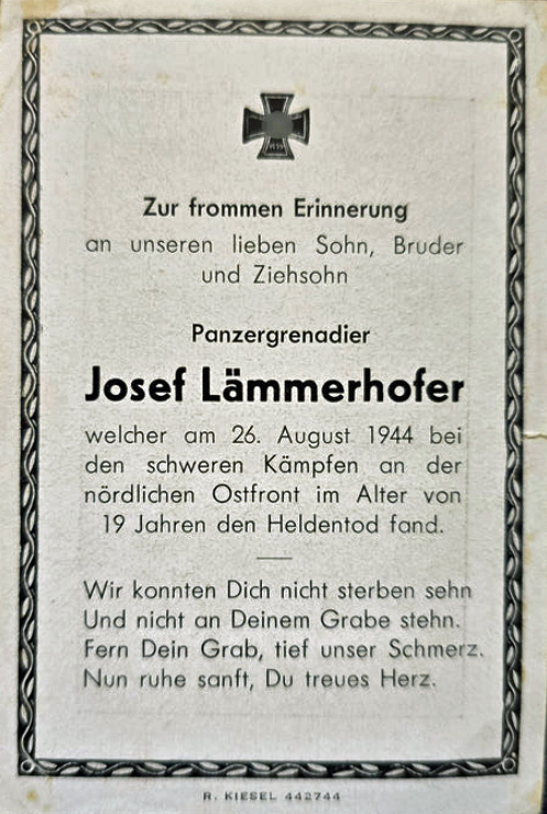Panzergrenadier Obergrenadier | LÄMMERHOFER | Josef | 24.09.1925 St. Martin | 26.08.1944 nördliche Ostfront, Kruopiai, Litauen |