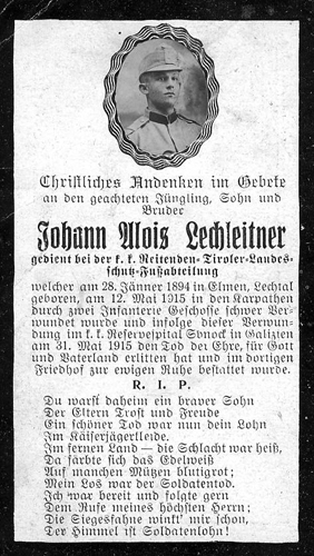 LECHLEITNER | Johann Alois | 30.01.1894 Elmen | 31.05.1915 im k.k. Reservespital Sanok Galizien | k.u.k. Reitende Tiroler Landesschutz-Fußabteilung | verwundet 12.05.1915 in den Karpathen, gestorben |