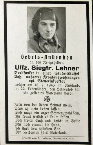 Unteroffizier | LEHNER | Siegfried | 06.09.1921 Simbach | 18.07.1943 Rußland, s.o. Ausgang Medwedki | Sturzkampf-Geschwader 2 „Immelmann“, 1. Staffel | Bordfunker, vermutlich als unbekannter Soldat auf die Kriegsgräberstätte Kursk - Besedino überführt |