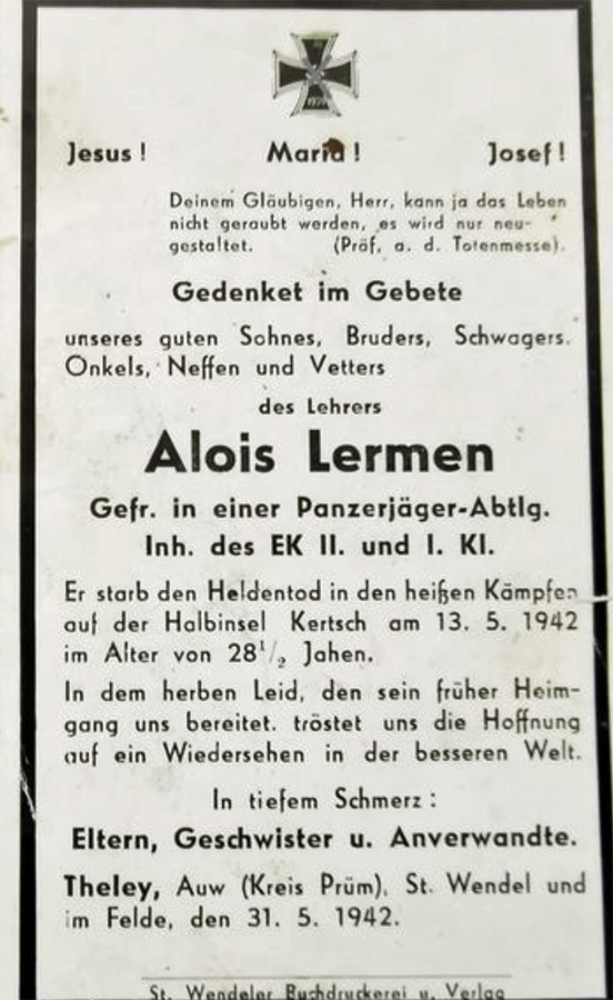Gefreiter | LERMEN | Alois | 12.12.1913 Theley | 13.05.1942 Halbinsel Kertsch, Marfowka | 2. Panzerjäger-Abteilung 132 | vermutlich als unbekannter Soldat auf die Kriegsgräberstätte Sewastopol - Gontscharnoje überführt |