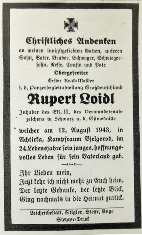 Obergefreiter | LOIDL | Rupert | 01.08.1920 Sieringhofen, Kreis Steyr | 12.08.1943 in Achtyrka, Kampfraum Bjelgorod | Panzerbegleitabteilung Großdeutschland, Panzer Art. Regt. Großdeutschland, 4.Bttr. | Erster Krad Melder, vermutlich als unbekannter Soldat auf die Kriegsgräberstätte Charkiw überführt |