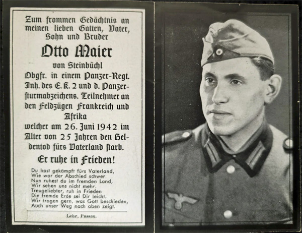 Obergefreiter | MAIER | Otto | 03.04.1917 Salzweg bei Passau | 26.06.1942 15 km westl. Marsa Matruh a.d. Bahnlinie sü. Berani - Marsa Matruh | Panzer‑Regt., Panzer Pionier Btl. 33, 2.Komp. | Kriegsgräberstätte in El Alamein: Gruft 5 |