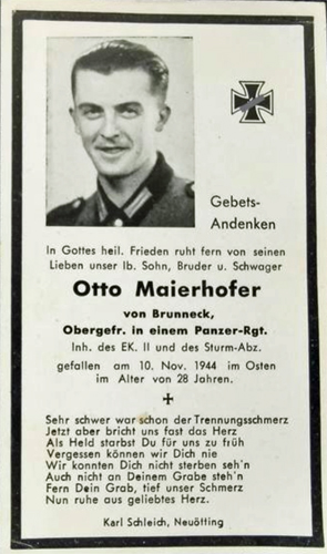 Obergefreiter Grenadier | MAIERHOFER | Otto | 02.07.1916 Brunneck | 10.11.1944 im Osten, bei Metraine | Panzer‑Rgt. |