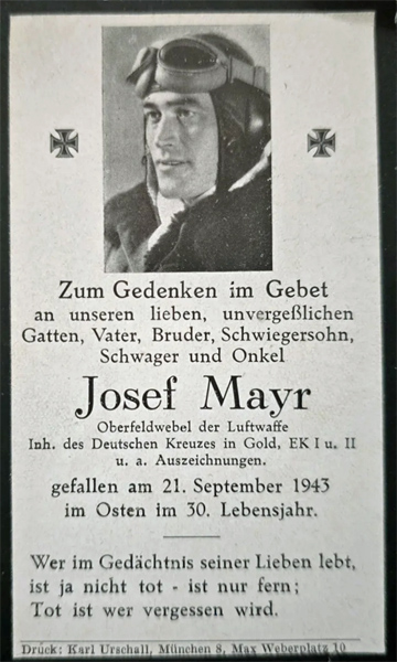 Oberfeldwebel | MAYR | Josef | 21.10.1913 | 21.09.1943 im Osten | Luftwaffe Nahaufklärungsgruppe 9 |