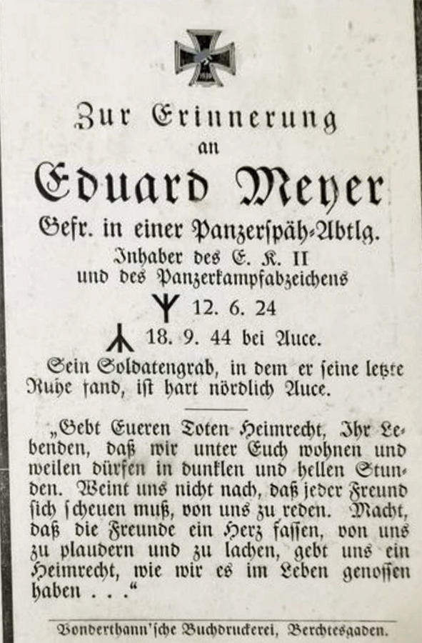 Gefreiter | MEYER | Eduard | 12.06.1924 Freilassing | 18.09.1944 bei Auce, 4 km sdöstl. Bene | Panzerspäh‑Abteilung, 3. Panzer Aufkl. Abt. 4 | begraben Frauenburg, Lettland |