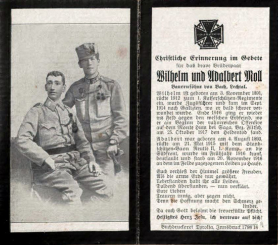 Standschützen-Baon Reutte II., 1. Kompanie | Bauernsohn, wurde im Frühjahr 1916 krank, beurlaubt und starb an dem im Felde zugezogenem Leiden zu Hause, begraben am 22.11.1916 in Stockach, Gemeinde Bach |