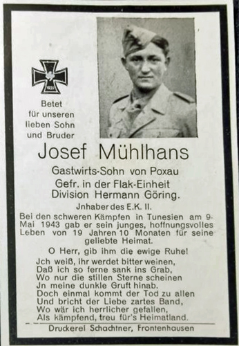 Gefreiter | MÜHLHANS | Josef | 06.07.1923 | 09.05.1943 10.05.1943 Tunesien | Flak‑Einheit, Division Hermann Göring | Kriegsgräberstätte in Bordj-Cedria: Hof MOR Ossario 1 Tafel 24 |