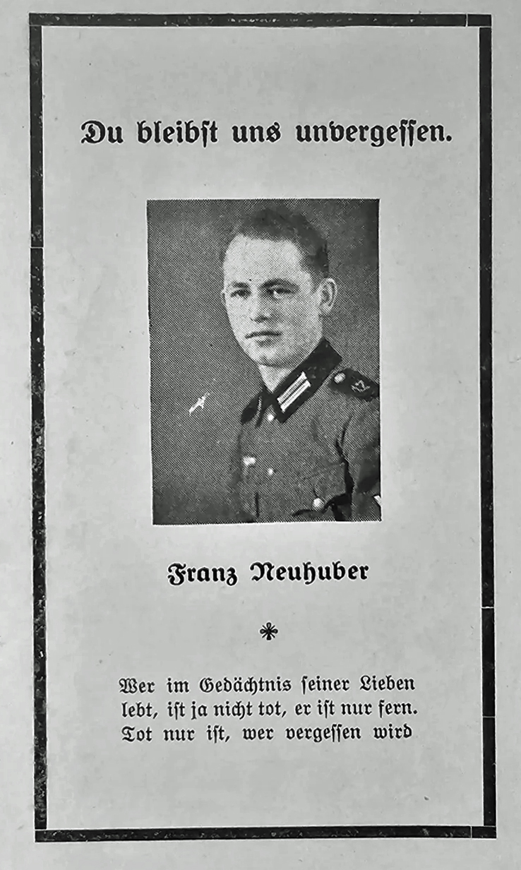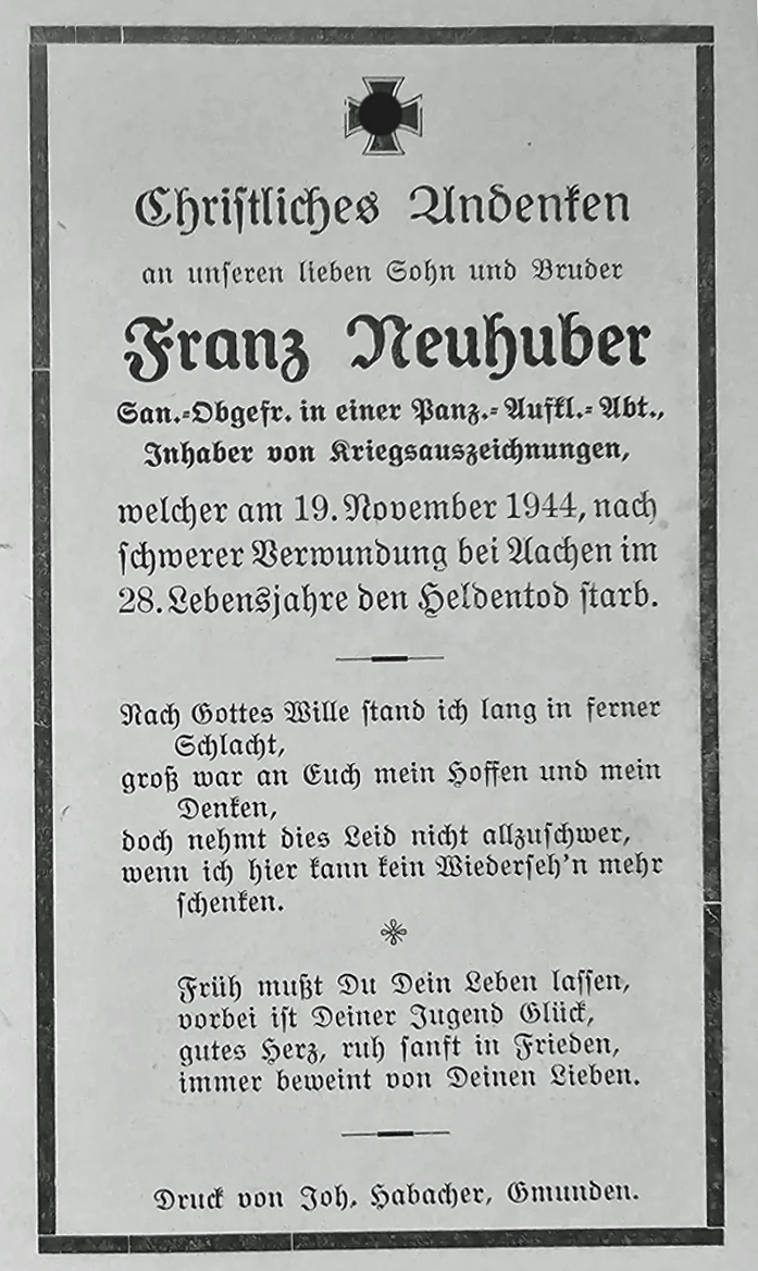 Sanitäts-Obergefreiter | NEUHUBER | Franz | 28.12.1917 Vorchdorf | 19.11.1944 bei Aachen, HVPl. Tuschenbroich | 2. Aufklärungs Abt. 9.Komp. | an Verwundung gestorben, Kriegsgräberstätte Wegberg: Grab 88 |
