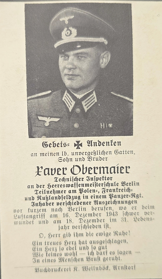 Technischer Inspektor | OBERMAIER | Xaver | 17.02.1913 Arnstorf | 18.12.1943 Res.Laz. 138, Berlin Neu‑Kölln | Heereswaffenmeisterschule Berlin-Treptow | verwundet Luftangriff am 16.12.1943, gestorben |