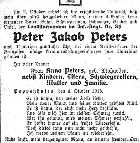 Landsturmmann | PETERS | Peter Jakob | 26.09.1915 Frankreich | Inf.‑Regt. 84 |
