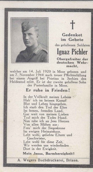 | Obergefreiter | PICHLER | Ignaz | 14.07.1920 Moos in Passeier |