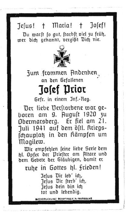 | Gefreiter | PRIOR | Josef | 09.08.1920 Obermarsberg | 20.07.1941 b. Mogilew |