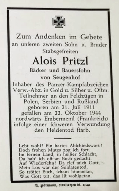 Obergefreiter | PRITZL | Alois | 21.07.1911 Seugenhof | 22.10.1944 nordwärts Embermenil, Asslingen | 4. Panz. Aufkl. Abt. 11 | Kriegsgräberstätte in Reillon: Block 1 Reihe 16 Grab 961 |