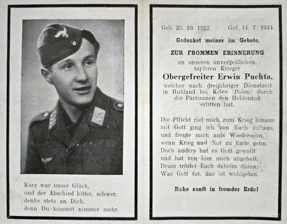 Obergefreiter | PUCHTA | Erwin | 20.10.1922 Neudorf | 14.07.1944 bei Kilce (Polen), Rela. I Kielce Teillaz. Alexander‑Haus |