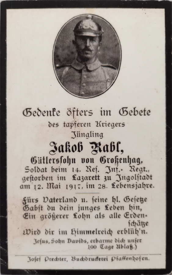 Soldat | RABL | Jakob | 22.06.1889 Großenhag, Oberb. | 12.05.1917 Lazarett Ingolstadt | 14. Res.-Inf.‑Regt. | † infolge Krankheit |