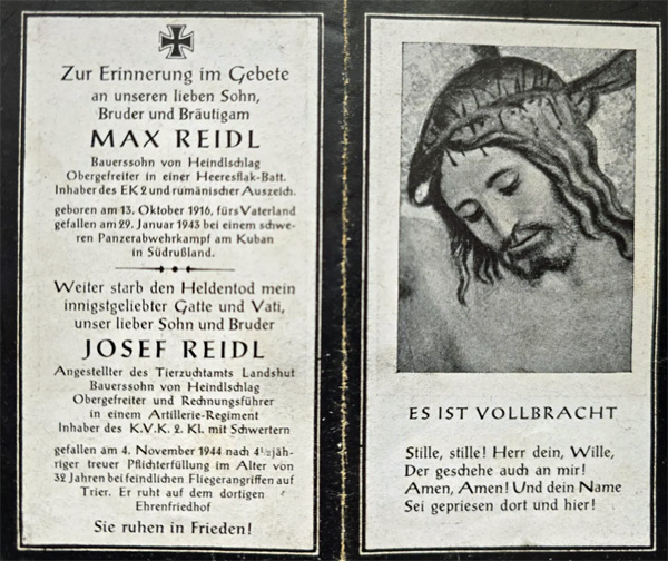 Obergefreiter | REIDL | Max | 13.10.1916 Heindlschlag | 29.01.1943 am Kuban, Süd‑Rußland, Tschernowskaja | Schwere Flak Batterie 287 | Grab derzeit noch in: Kuschtschewskaja - Russland |