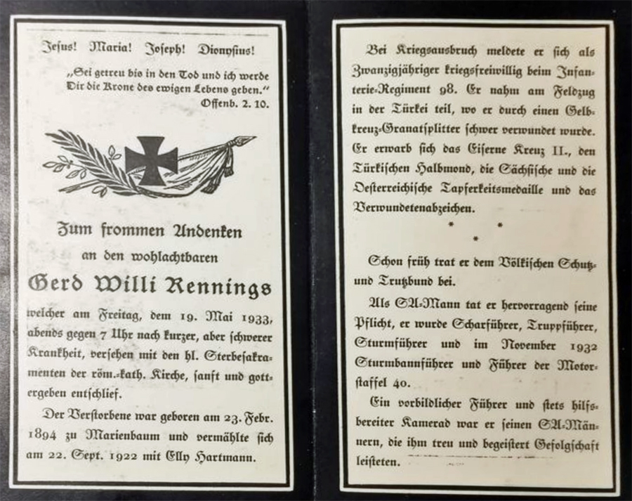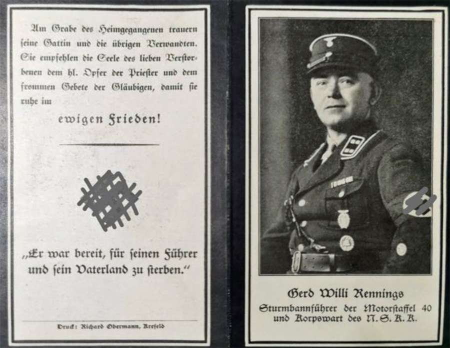 Sturmbannführer | RENNINGS | Gerd Willi | 23.02.1894 Marienbaum | 19.05.1933 | N.S.K.K. Motorstaffel 40 | an Krankheit gestorben |