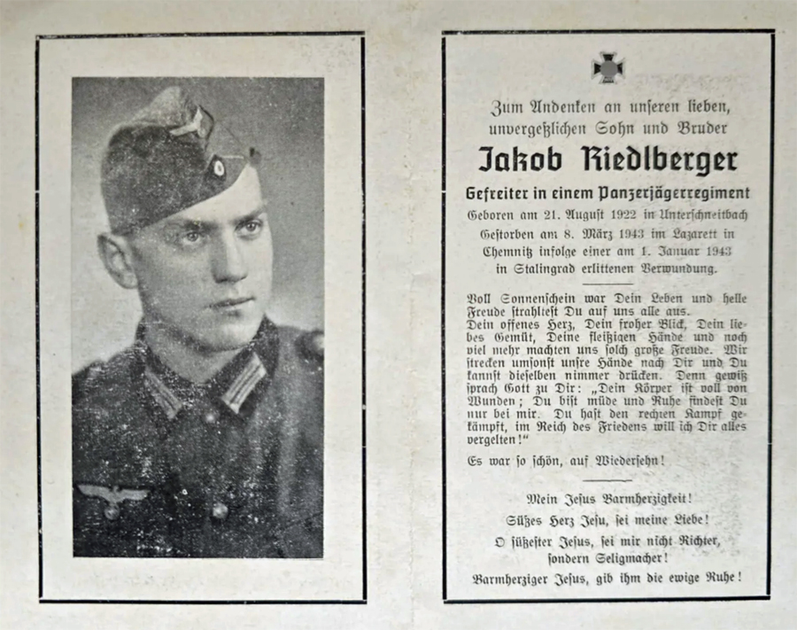 Gefreiter | RIEDLBERGER | Jakob | 21.08.1922 Unterschneitbach | 08.03.1943 Res. Lazarett II in Chemnitz | Panzerjägerregiment, 1. Panzer-Jäger Abt. 61 |