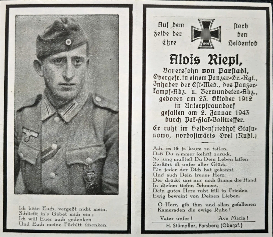 Obergefreiter | RIEPL | Alois | 23.10.1912 Unterpfraundorf | 02.01.1943 Kusnezowo | Panzer-Grend.Regt. 33, 5.Komp. | vermutlich als unbekannter Soldat auf die Kriegsgräberstätte Kursk - Besedino überführt |