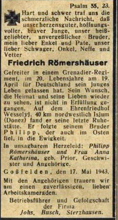 Gefreiter | RÖMERSHÄUSER | Friedrich | 12.06.1923 Goßfelden | 19.04.1943 Mossoroff-Bairak | Grenadier‑Regiment I.R.88, (15.ID) | Kriegsgräberstätte in Charkiw: Block 11 Reihe 6 Grab 296 |