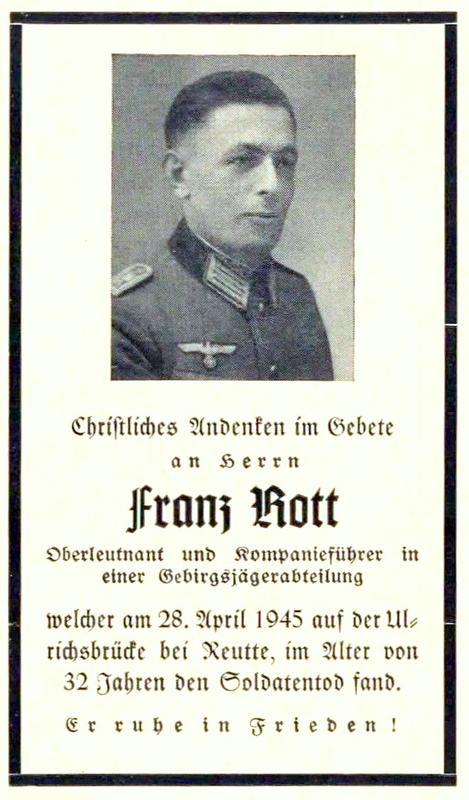 Oberleutnant und Kompanieführer | ROTT | Franz Xaver | 10.11.1912 Söll | 28.04.1945 auf der Ulrichsbrücke bei Reutte | Gebirgsjägerabteilung | Kriegsgräberstätte in Pflach: Grab 42 |