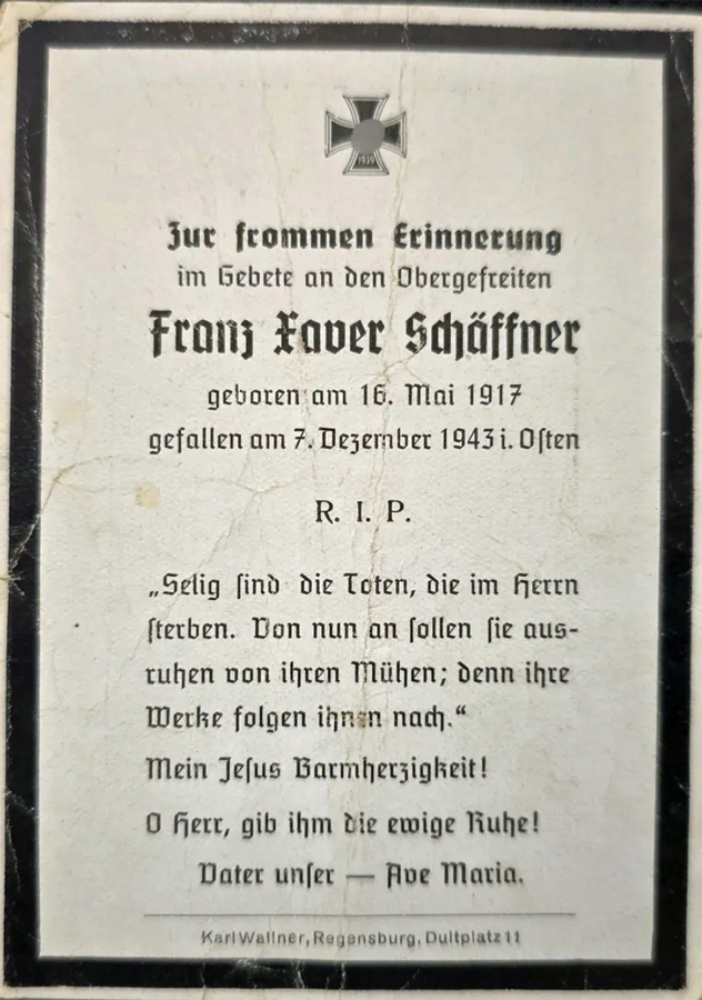 Obergefreiter | SCHÄFFNER | Franz Xaver | 19.05.1917 Schmalzgrub | 07.12.1943 Chersonka | 1. Fahrschwadron Division Nachschubtruppe V 282 |