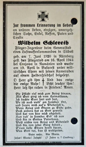 Oberstleutnant | SCHLERETH | Wilhelm | 07.06.1920 Nürnberg | 16.04.1944 bei Crajowa, Rumänien, 15 km n.ö. Slatina a.d.Str. Slatina- Piteshi |