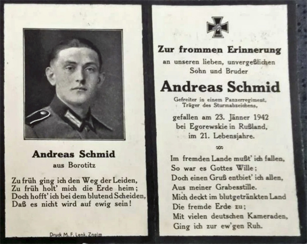 Gefreiter, Schütze | SCHMID | Andreas | 24.10.1921 Borotitz, Kreis Znaim | 23.01.1942 Egorewskie, Egorewskoje | Panzerregiment, Inf. Regt. 118 (mot) | Grab derzeit noch in: Mikuljniki / Gagarin - Russland |