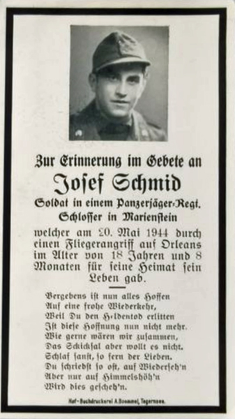 Schütze | SCHMID | Josef | 25.09.1925 Marienstein | 20.05.1944 Orleans, Les Aubrais | Panzer‑ 3. Reserve Panzer Jäger Regt. Abt. 7 | Kriegsgräberstätte in: Fort-de-Malmaison: Block 4 Reihe 22 Grab 841 |