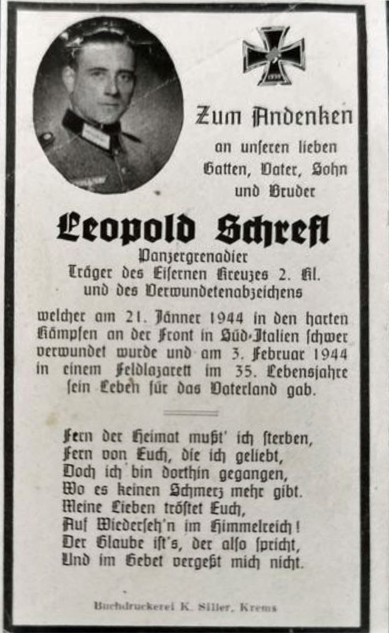 Panzergrenadier | SCHREFL | Leopold | 27.10.1909 Meidling | 21.01.1944 Süd-Italien, Feldlaz. Anagni | Gren. Regt. 15 (mot), 3.Komp. | Kriegsgräberstätte in: Block 7 Grab 450 |