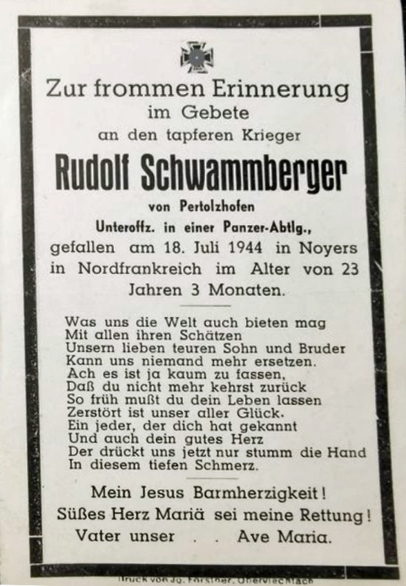 Unteroffizier | SCHWAMMBERGER | Rudolf | 11.04.1921 | 18.07.1944 in Noyers | Panzer‑Abeilung | Kriegsgräberstätte in La Cambe: Block 4 Reihe 8 Grab 286 |