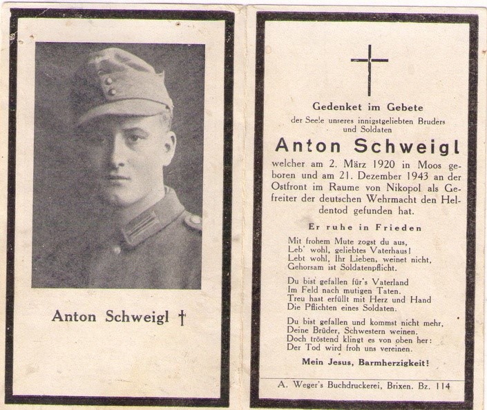 | Gefreiter | SCHWEIGL | Anton | 02.03.1920 Moos in Passeier |