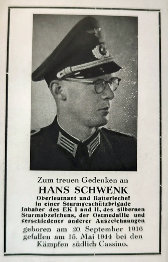 Oberleutnant und Batteriechef | SCHWENK | Hans | 20.09.1916 München | 15.05.1944 südlich Cassino, nördlich Pignataro | 2. Sturm-Geschütz Brigade (Mot) 907 | Kriegsgräberstätte in Cassino: Block 15 Grab 422 |