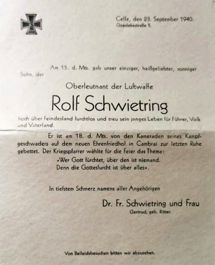 Oberleutnant | SCHWIETRING | Rolf | 11.07.1915 Celle | 15.09.1940 Kanal, Angriff auf London, Raum Cambrai | begraben in Cambrai, Kriegsgräberstätte in Bourdon: Block 22 Reihe 8 Grab 302 |