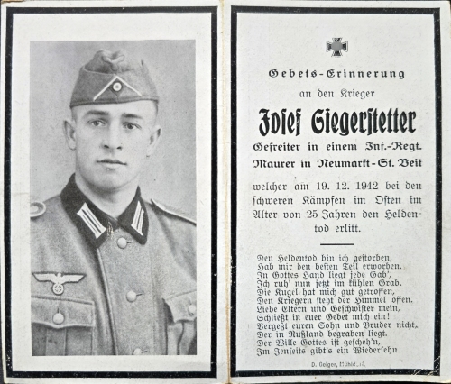 Gefreiter | SIEGERSTETTER | Josef | 27.10.1918 Schönberg | 19.12.1942 im Osten, Jurkowo, ostwärts Ssytschewka | Inf.‑Regt. Gren. Regt. 688, 6.Komp. | Grab derzeit noch in: Netertowka - Russland |