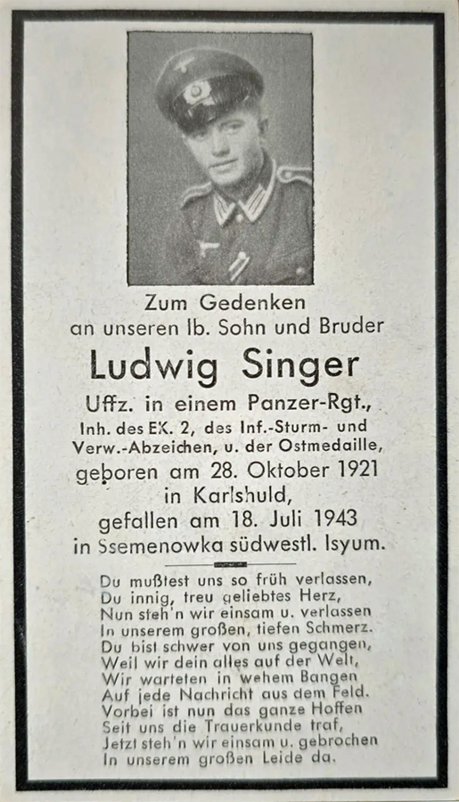 Unteroffizier | SINGER | Ludwig | 28.10.1921 Karlshuld | 18.07.1943 Ssemenowka südwestlich Isyum, Donez | Panzer Gren. Regt. 40, 6.Komp. |