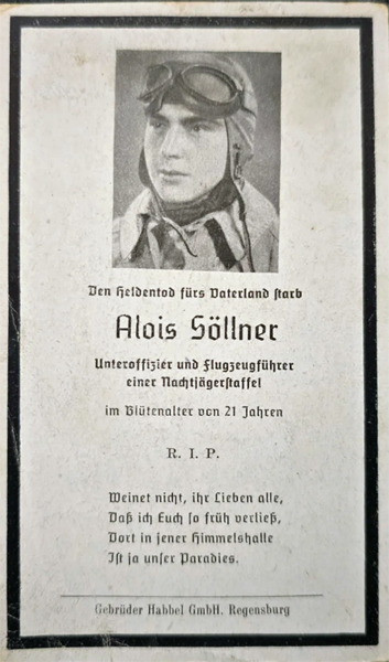 Unteroffizier Flugzeugführer | SÖLLNER | Alois | 08.03.1923 Regensburg | 02.11.1944 3 km südöstl. Flugpl. Achmer |