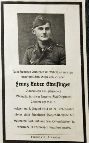 Obergefreiter | STREIFINGER | Franz Xaver | 22.07.1920 Hötzendorf | 04.08.1944 Siksmiai | schweres Flak-Regiment 4 (mot.) | begraben in Ebenrode, Ostpreußen, Kriegsgräberstätte in Cernjachovsk / Tschernjachowsk: Block 1 Reihe 13 Grab 931 |