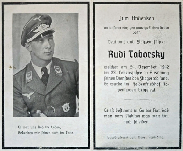Leutnant und Flugzeugführer | TABORSKY | Rudi | 03.03.1920 Taiskirchen | 24.12.1942 Res.Laz. Kopenhagen | Schülerkompanie Blindflugschule 4 | verwundet Flugplatz Kastrup, gestorben, Kriegsgräberstätte in Kopenhagen West: Block A Reihe 8 Grab 203 |