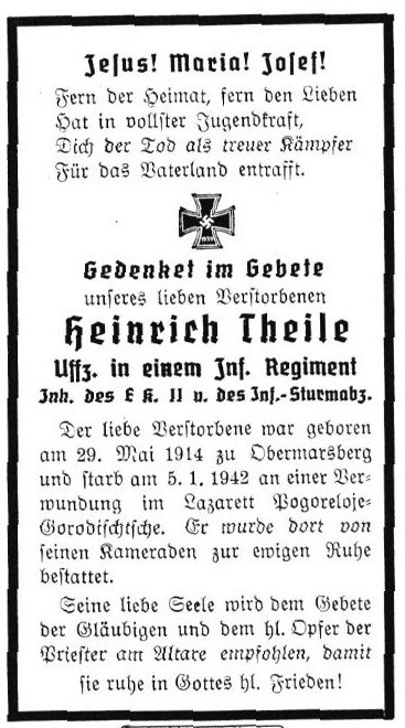 | Unteroff | THEILE | Heinrich | 29.05.1914 Obermarsberg | 05.01.1942 Laz Pogoreloje-Gorodischtsche |