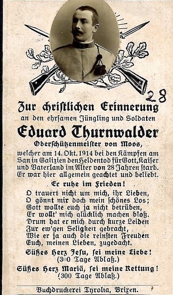 | Oberschützenmeister | THURNWALDER | Eduard | 28 Jahre | 14.10.1914 am San, Galizien |